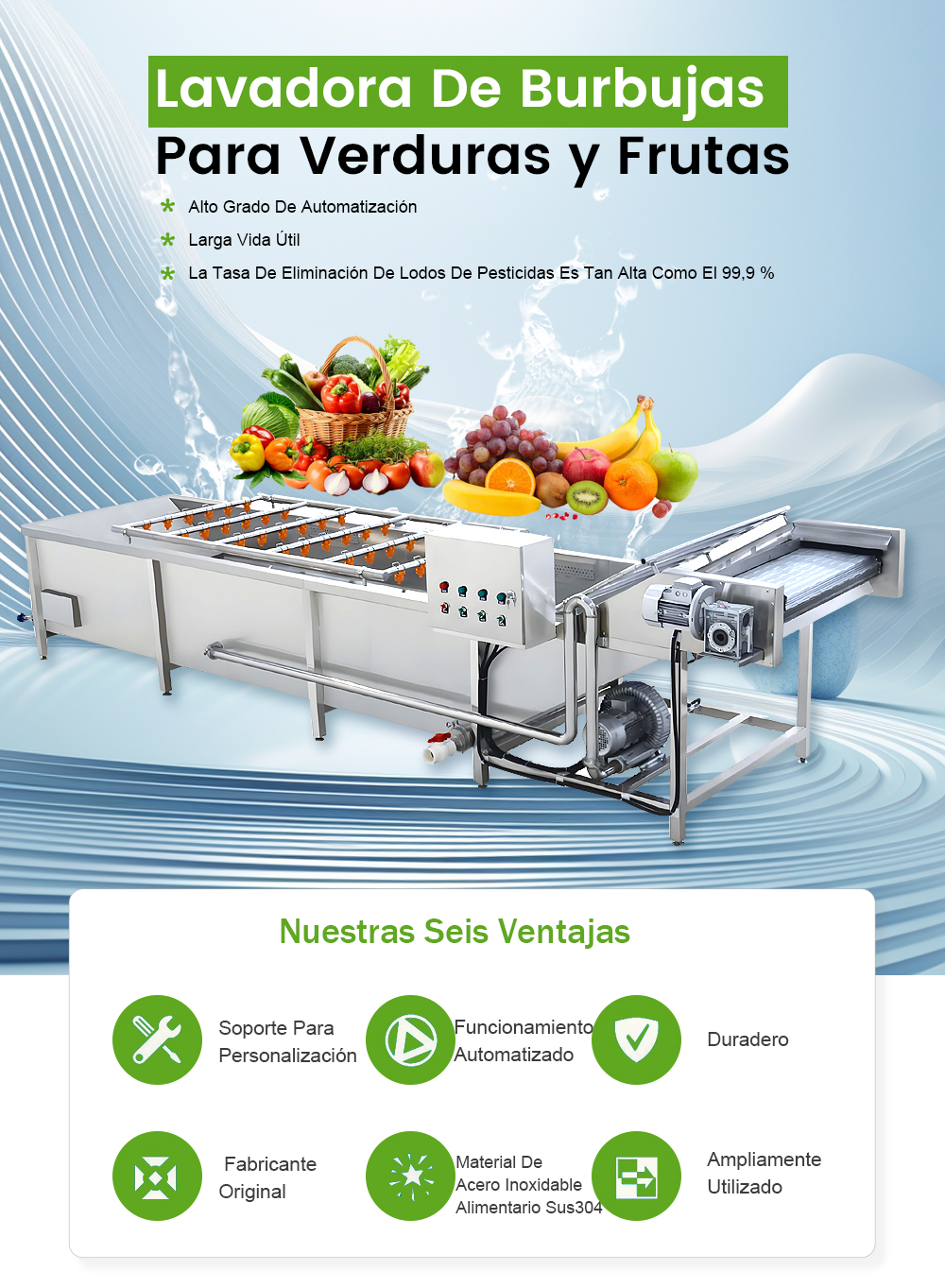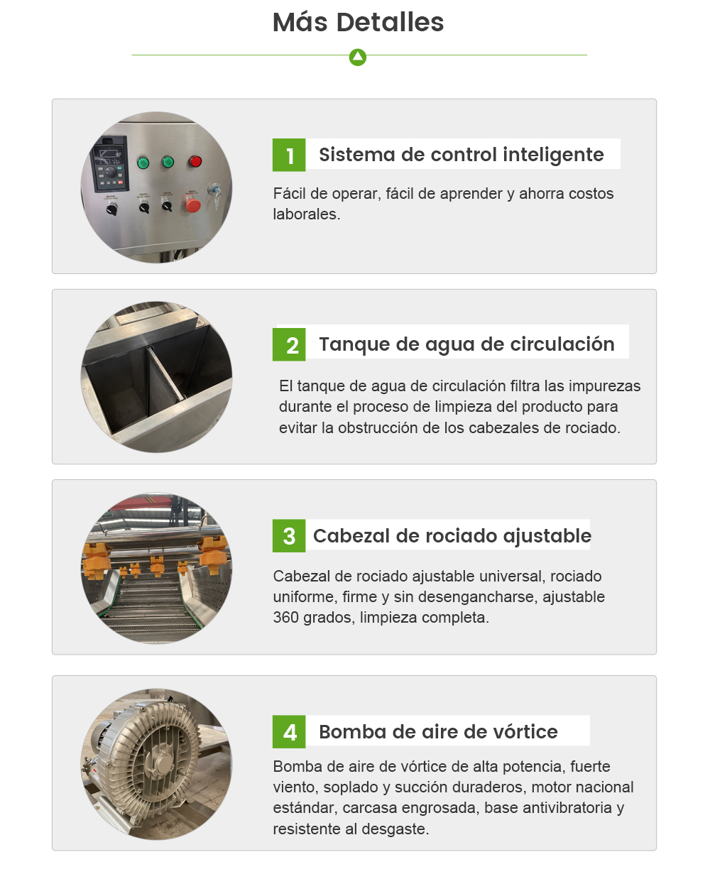 Cuando el material cae en el agua, el agua turbulenta en el tanque de agua se mezcla y limpia el material. Las burbujas son producidas por gases de alta presión, lo que hace que el material se vuelque. La suciedad pesada, como la tierra y la arena en el material, se separa y cae en la zona de precipitación debajo del filtro. El material se mueve gradualmente sobre la cinta transportadora impulsada por el agua y es empujado constantemente hacia adelante por la cinta transportadora para sacarlo del tanque Interior. Cuando sale del agua, se instala un aspersor en la gama alta, se limpia el material dos veces después de la pulverización y la limpieza, y luego pasa al siguiente proceso.